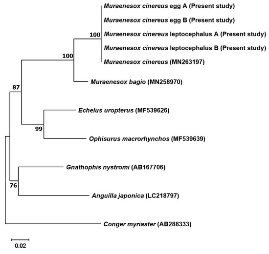 The neighbor-joining tree showed that M. cinereus eggs and preleptocephali were clustered perfectly with adult M. cinereus (Figure 2) and the next nearest neighbor was M. bagio.