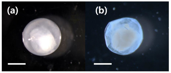 Photograph of an eggs of M. cinereus collected from waters adjacent to Jeju Island. (a) egg diameter = 2.1 mm, (b) egg diameter = 2.0 mm. Scale bar = 1.0 mm.