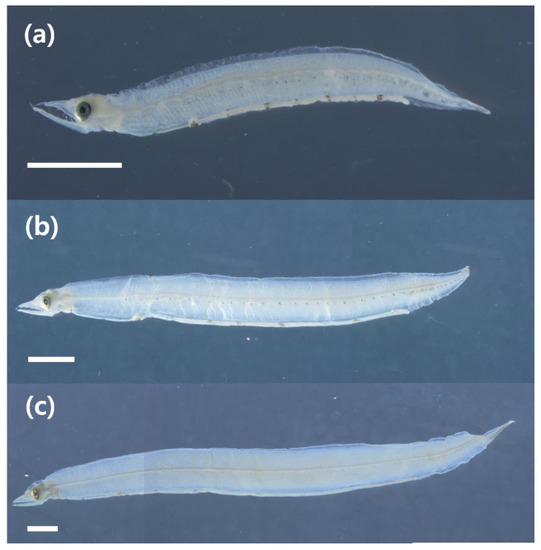 Photograph of preleptocephalus and leptocephali of M. cinereus collected from waters adjacent to Jeju Island: (a) preleptocephalus, total length (TL) = 11.5 mm, (b) leptocephalus, total length (TL) = 23.5 mm, (c) leptocephalus, total length (TL) = 34.4 mm Scale bars = 2.0 mm.