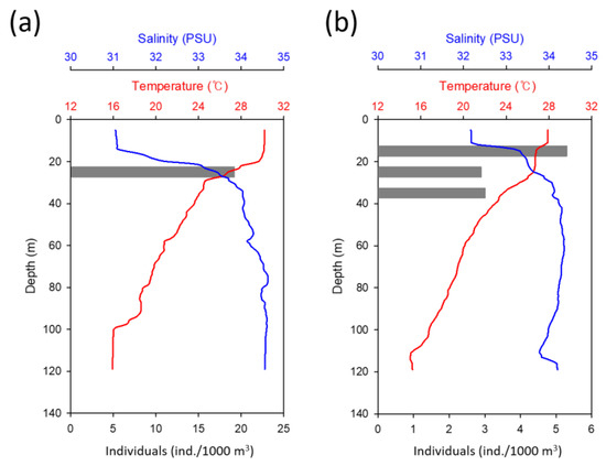 Water depth, salinity, and temperature distribution of M. cinereus eggs and preleptocephali collected in this study. (a) M. cinereus eggs, (b) M. cinereus preleptocephali and leptocephali.