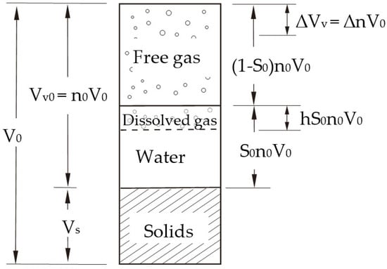 where is the degree of water saturation, is Henry’s volumetric solubility parameter of the gas, is the current absolute pore water pressure, and is the compressibility coefficient of the pore water. Henry’s constant changes with different gas and liquid combinations. For example, for the carbon dioxide–water mixture, is 0.86, and regarding the methane–water mixture, is 0.034 [4]. It should be noted that the degree of saturation changes due to the change in the fluid volume in the incremental calculation; the ith step of the saturation is expressed by (ei = void ratio, = volumetric strain).