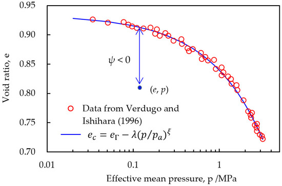where , , and are the sand parameters defining the critical state line in the e–p space (Li & Wang, 1998), and is the atmospheric pressure for nondimensionalization. When > 0 (looser than critical), the soils are compressed during drained shearing, or the pore pressures increase during undrained shearing; when < 0 (denser than critical), the soils dilate, or the pore pressures decrease.