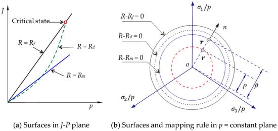 where is the effective stress tensor, is the effective mean stress, is the deviatoric stress tensor, and is the second-order identity tensor. The deviatoric stress ratio tensor is defined as , and the stress ratio invariant is defined as , which is used to determine three bounding surfaces: the failure surface, R − Rf = 0, the maximum prestress surface, R − Rm = 0, and the dilatancy surface, R − Rd = 0; in the p-J space (J = pR); these surfaces become three lines, as shown in Figure 3a. The model supposes that the bounding surfaces are conical shapes in a three-dimensional principal stress space and circular shapes on the π-plane in the stress ratio space, as shown in Figure 3b; an image stress point is defined as the intersection of the Rm surface with the straight line connecting the origin point and the current stress state in virgin loading. The scalar quantities and are the distances from point o to or , respectively.