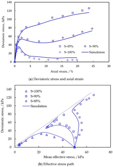 The modified model adopted a state-dependent dilatancy stress ratio and a failure stress ratio, which could predict the phase transformation and the failure behavior of gassy sand with different saturation degrees, as illustrated in Figure 4b; because the variable compressibility of the miscible fluid was used to describe the volume change characteristics of the gas–liquid mixture, it could better simulate the increase in the mean effective stress at the beginning of the stress path, when the saturation degree was lower and the later dilatancy characteristics after it crossed the phase transformation line; however, no phase transformation was found, and the strength was lower in the saturated loose sand.