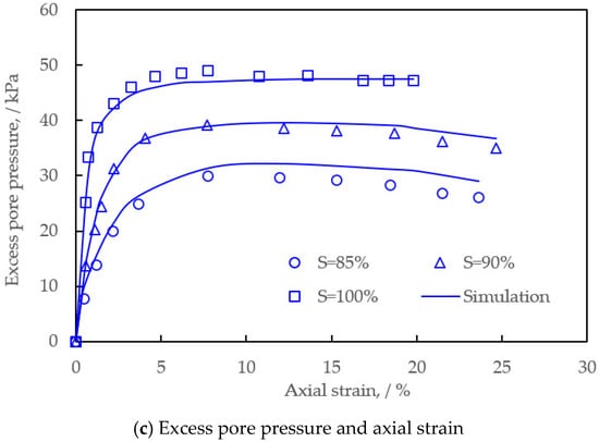 Figure 4 and Figure 5 show the experimental deviatoric stresses, mean effective stresses, pore water pressures, and the simulations given by the modified bounding surface hypoplasticity model with the parameters provided in Table 1. It is seen that the model predictions and the experimental data matched each other quite well for the three saturation degrees or gas contents. For loose sand with Dr = 30%, the existing gas increased the triaxial undrained shear strength, while the peak strength occurred at larger deformation. With the increase in the gas content, the stress–strain behaviors gradually changed from strain softening to hardening, which was probably due to the compression and dissolution of gas, reducing the fluid stiffness significantly. It is noted that it may result in the excess pore pressure accumulation being decreased and delayed and the effective stress being increased, such that the undrained strength was higher than the saturated state. Under undrained conditions, the shear shrinkage or dilatancy could be seen from the changes in excess pore water pressure, as illustrated in Figure 4c and Figure 5b, which increased at the initial loading stage, but slowly in gassy soil because of gas compression or dissolution, later whether it reduced or not depended on the initial saturation degree when the gas content was higher, the excess pore pressure may decrease significantly, this was because the gas exsolution and fluid compressibility increased. Comparing Figure 4 and Figure 5 revealed that when the gas content was identical, the deviatoric stress strength of the gassy soil increased with the higher effective confining pressure. However, strain hardening and shear dilatancy decreased considerably and even disappeared because the particle movement and gas exsolution were strongly constrained in microscopic view (see Figure 5).