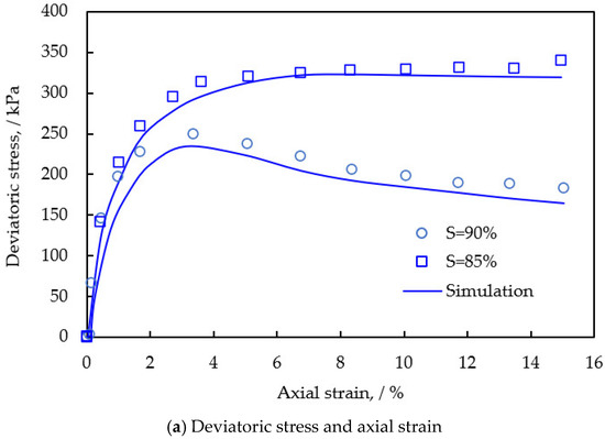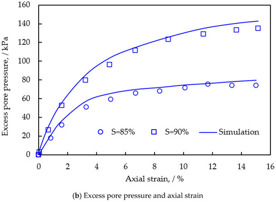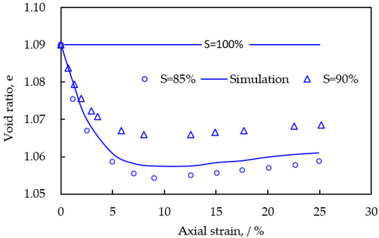 In addition, the higher the gas content of the gassy sand was, the faster the void ratio decreased, or the compactness increased under the undrained condition; the more significant the later dilatancy was, which was similar to the behavior of saturated dense sand, this indicated that the gassy sand changed from shear contraction to dilatancy due to the increase in free gas content. The relation between void ratio change and axial strain is shown at lower confining pressure in Figure 6, where the simulation referred to the saturation degree of 85%. It demonstrates that the modified model can predict that the gassy sand dilates after a small compression as the axial strain increases.