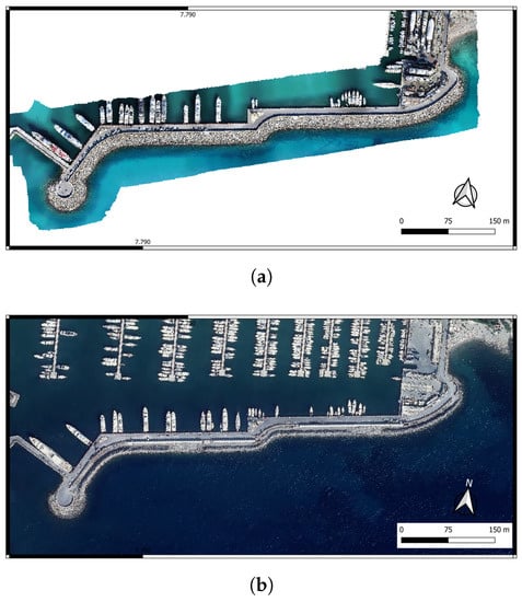 Portosole. The UAV-derived orthophoto related to Portosole covers an area of 400 × 800 m2. The UAV survey was conducted at 35 m AGL with a DJI Phantom 4 Pro, resulting in a Ground Sample Distance (GSD) of 7.2 mm. The orthophoto was produced by Drafinsub Srl. using the photogrammetric suite Agisoft Metashape© [46], framed in the ETRS89 reference system and projected in the Universal Transverse Mercator (UTM) zone 32N (EPSG code: 32632), with a 2 cm pixel resolution.