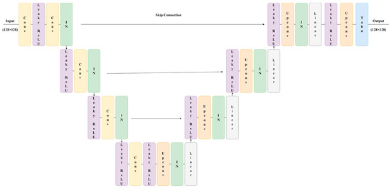 As is shown in Figure 2, the generator in this study employs the U-net [28] architecture, which includes both up sampling and down sampling. The network undergoes three rounds of up sampling and three rounds of down sampling. The “Upconv” layer represents the up-sample layer that uses a transposed convolution operator. The “Tanh” layer represents the non-linear activation function, Tanh. Additionally, intermediate skip connections enable the network to retain low-level features while performing feature fusion with high-level information. Instance normalization [29] is denoted as “IN”. During up sampling, the IN layer is replaced with the Adaptive Instance Normalization (AdaIN) layer, which consists of the IN and Linear layers. The AdaIN layer incorporates label information through one-hot encoding, thereby allowing the generator to learn the label information of the domain.