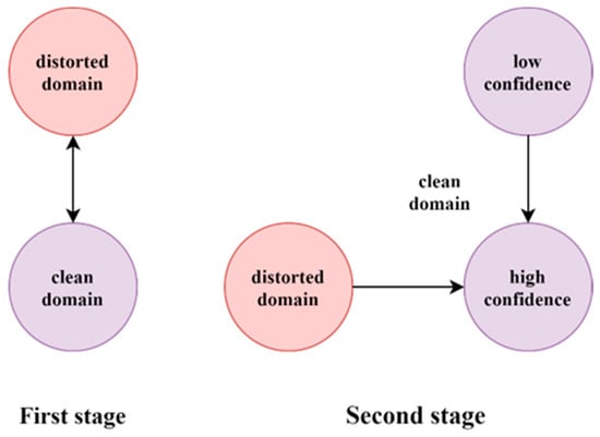 As is shown in Figure 4, the first stage of the training process is the transformation between the distorted domain and the clean domain, and the second stage is the inverse labeling of samples with low confidence values in the clean domain to the distorted domain. Then, both domains are transformed to the domain with high confidence values in the clean domain. For these images, it did not particularly conform to the characteristics of the good domain, and the label needed to be reversed into a distorted domain, so the method in the right figure of Figure 4 was used in the second stage of training. According to the confidence value, domains below 0.55 are considered domains with low confidence values in the clean domain, and inverting their labels as distorted domains can improve the final restoration effect. The label adopted one-hot encoding, and the largest class probability among the two probabilities output by the auxiliary classifier in the discriminator was used as the confidence value. In this section, experiments were performed using Moon’s [17] method and the improved confidence value method combined with image restoration networks, respectively.