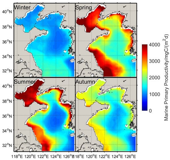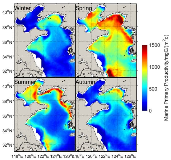 The spatial distribution of the climatological mean PP in the Yellow and Bohai Seas for the four seasons.