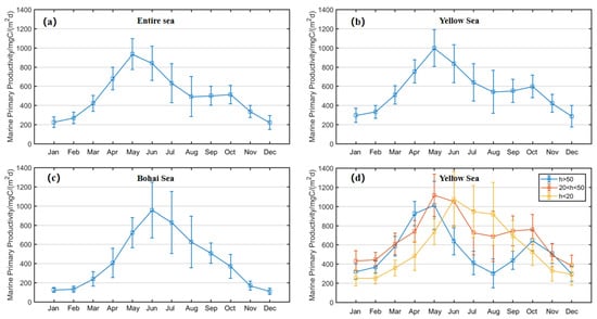 The monthly variability of spatially averaged PP in different regions is shown in Figure 3. For the entire study area (Figure 3a), the PP exhibited a bimodal distribution, with two peaks occurring in May and October with values of 935.4 and 512.8 , respectively. However, the peak in October was weak and significantly lower than the peak in May. The minimum PP occurred in January and December, with a value of approximately 200 . The ranking of PP magnitude of the four seasons was spring (818.4 ) > summer (541.4 ) > autumn (357.1 ) > winter (305.9 ). The standard deviations from May to August exceeded 100 , indicating significant interannual differences in the PP from 2003 to 2020. The seasonal variation of the mean PP in the Yellow Sea (Figure 3b) was similar to that of the entire area, with slightly larger monthly mean values and standard deviations. In the Bohai Sea (Figure 3c), a single peak occurred in June (957.2 ), and the standard deviation was over 250 from June to August. The annual mean PP in the Bohai Sea was approximately 432.7 , which was lower than that in the Yellow Sea (564.1 ).