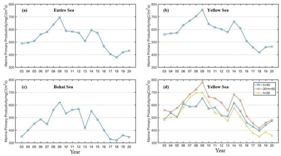 The PP in the Yellow and Bohai Seas showed significant interannual differences (Figure 4). The average PP in the entire sea area reached its highest level (~700 ) in 2009 and its lowest level (~380 ) in 2018. The average PPs in the Yellow Sea and the Bohai Sea followed a similar trend (Figure 4a–c), with a rapid increase from 2003 to 2009 and a subsequent rapid decrease until 2018. After 2018, there was a slight increase. The maximum PP in 2009 were 756.3 and 624.7 , and the minimum PP in 2018 which were 416.8 and 320.5 for the Yellow Sea and the Bohai Sea, respectively. The PPs showed an overall decrease from 2003 to 2020, with a decrease rate of about 5–6 . The interannual variability of PPs in different subregions of the Yellow Seas are similar (Figure 4d). The magnitude of the interannual variability of the PP of the central Yellow Sea was smaller than that of the other two subregions with relatively shallow water depth.