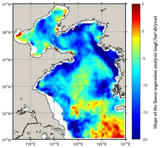 The linear regression analysis on the PP of the Yellow and Bohai Seas from 2003 to 2020 was conducted to further investigate regional differences in the interannual trend of PP. The slope of the linear regression was used to quantify the rate of the interannual change. As shown in Figure 5, there is a significant difference in the slope of the linear regression between the nearshore and offshore areas. In most areas, the slope value was negative, indicating a decreasing trend in PP. In the Yellow Sea, the decreasing rate in the central region was less than 8 , which was only about a half of that in the shallow water region (h < 50 m), indicating that the latter had a faster decrease in PP in the past 20 years. In contrast, in the Bohai Sea, the decline rate in the central region was larger than that in the coastal waters, indicating that the central Bohai Sea had a faster decrease in PP.