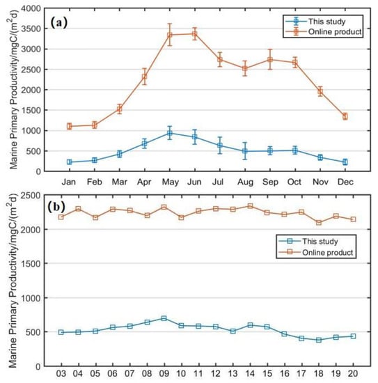 (a) Monthly variations of the spatially averaged PP for the online product and this study. (b) Interannual variations of the spatially averaged PP from 2003 to 2020 for the online product and this study.