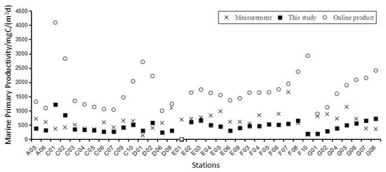 Based on the beforementioned results, obvious differences were observed between the PPs of the Yellow and Bohai Seas obtained from the online product and those obtained in this study. In order to evaluate the accuracy of their PP estimates, the PP values were compared with in situ measurements. The PP values measured at 37 stations during the Yellow Sea cruise in September by Choi et al. [41] were used for comparison with the results of the satellite estimates. As shown in Figure 8, the PP obtained in this study was found to be much closer to the in situ measurements as compared to that of the online product. The PP from the online product was 3–5 times significantly higher than the measured PP and the PP estimated in this study. The average PP of the measurements was approximately 600 , while the average PP estimated by this study for all sites was approximately 500 , which is in close agreement with the measurement value. In contrast, the average PP obtained from the online product for the Yellow Sea was approximately 1700 , which was more than three times the value obtained in this study, suggesting that the online PP product significantly overestimated the PP in the shelf seas. Therefore, it is recommended that, when using the VGPM model to estimate the PP in shelf seas, the input satellite data and the parameterization scheme of should be calibrated and improved to reduce the bias.