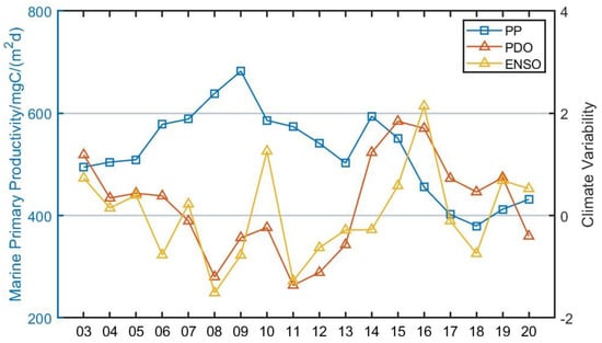Interannual variations in the PP in the Yellow and Bohai Seas and the PDO and ENSO (Niño) indexes from 2003 to 2020.