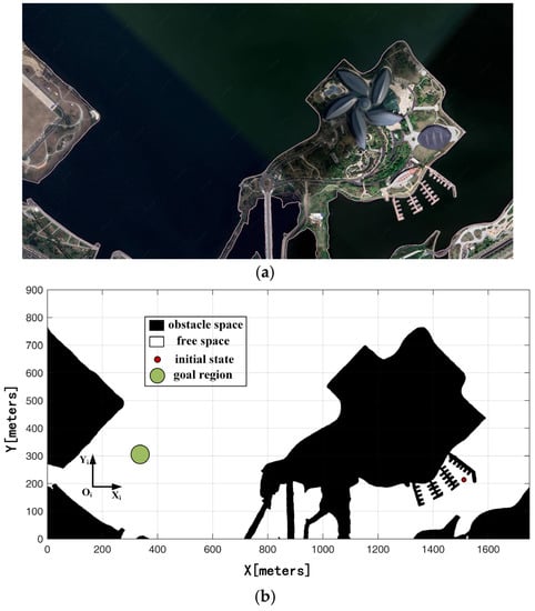 The global map is shown in Figure 2. This map is provided by Google Map, and the location is Dishui Lake in Lin-gang Special Area, Shanghai. Let denote the state space, denote the obstacle space, and the free space is represented by a subset . Motion planning aims to identify a collision-free path from the start point to the goal region on the global map. All dynamic constraints must be satisfied by this path. Let denote the control space, and finding a path can be regarded as finding a set of motion control inputs . The Eulerian integral representation is used in this study to express the USV motion dynamic expression: