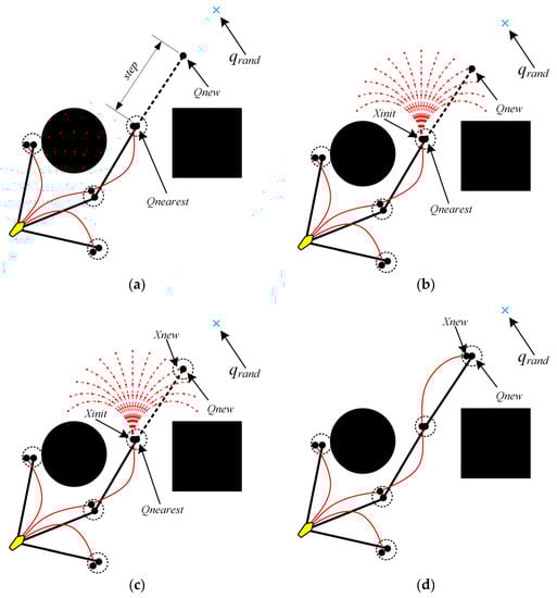 In Algorithm 1, Line 2–3, space is extended in the same manner as in the basic RRT algorithm. As shown in Figure 3a, is obtained by sampling the entire space at random. is determined by traversing the entire tree ( tree nodes are marked with capital letters Q). In order to obtain the extended node , the tree is grown step by step starting from .