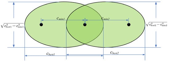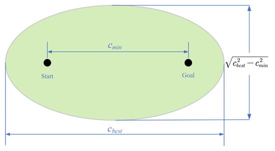 The RRT algorithm is susceptible to blind sampling and low search efficiency if it is explored randomly in the space. In other words, there is no probability that the RRT algorithm will construct an optimal path within a finite number of iterations [35]. In order to enhance the sampling aspect of the algorithm flow, an asymptotical optimization strategy [35,36] is used. The Informed-RRT* algorithm is composed of two phases, the initial path-finding phase and the initial path being found phase. In the previous phase, the process is the same as that in the basic RRT algorithm. In the later phase, the elliptic sampling domain is determined based on the found path length, the start point, and the goal position, as well as the distance between these two points, as shown in Figure 4. The long-axis distance of the elliptic sampling domain is the current path , whereas the short-axis distance is .