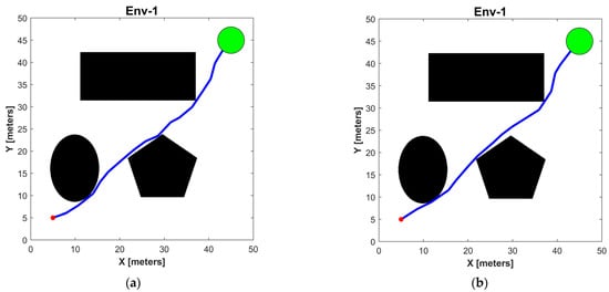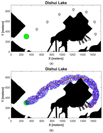 Due to the scale of the Dishui Lake scenario being 630 times that of the three obstacle scenarios, intermediate waypoints (shown in Figure 13a) are set accordingly. The start point is [1520,230], the goal region consists of a circle with coordinates [300,300] as the center and 3 m as the radius, and the initial state of the USV is [0.5,0,0,1520,230,−pi/4].