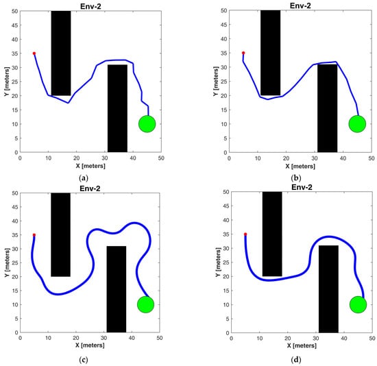 Results of path under scenario 2: (a) RRT*; (b) Informed-RRT*; (c) spRRT; (d) spRRT-Informed.