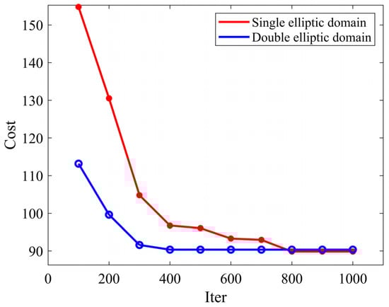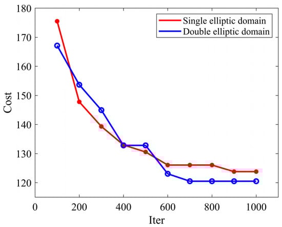 In scenario 2, the inclusion of the USV motion model improves steering performance by over 72.563%. In the performance indicator of sailing time, the spRRT-Informed has an average reduction of 12.377% compared to the spRRT. The standard deviation is reduced by 84.887%. In the performance indicator of distance, spRRT-Informed is on average 6.636% shorter compared to spRRT. The standard deviation is reduced by 47.554%. According to the analysis of the simulation results in Scenario 1, spRRT-Informed offers a significant advantage in terms of algorithm exploration performance over spRRT. As shown in Figure 10, in the case of different elliptic domains, the sailing time of optimal paths is examined at 100 intervals over a maximum of 1000 iterations. It is evident from the descent curves in the figure that, in a “bypassed” environment, the double elliptic sampling domain performs better in finding the optimal solution.