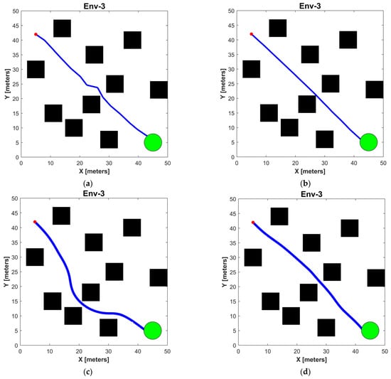 Results of path under scenario 3: (a) RRT*; (b) Informed-RRT*; (c) spRRT; (d) spRRT-Informed.