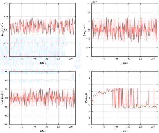 where and represent the velocity (in the body reference system) and position (in the inertial reference system) in plane motion, respectively, as shown in Figure 1. and are interconverted by Formula (2). is the system inertia matrix, consisting of rigid body inertia and hydrodynamic added inertia. is the centrifugal and Coriolis forces and moments acting on the ship. It is only effective when certain steering maneuvers are performed by the USV. is the hydrodynamic damping forces and moments acting on the ship, ensuring that the system output is bounded.