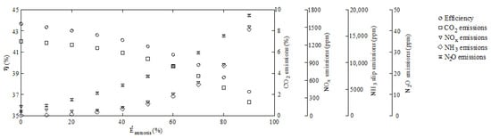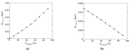 The mass flow of ammonia and diesel oil required to obtain 320 kW power is shown in Figure 8. The range from 0% ammonia (i.e., 100% diesel oil) to 90% ammonia (i.e., 10% diesel oil) was analyzed. Obviously, as the percentage of power contribution from ammonia is increased, the mass flow of ammonia is higher and the mass flow of diesel oil lower. The relation is not exactly linear due to thermal efficiency—Figure 1 and Equation (2)—which is reduced as the percentage of power contribution from ammonia is increased. The use of ammonia reduces the thermal efficiency because ammonia presents a slow combustion and some non-reacting ammonia is emitted through the exhaust gases. Moreover, as more ammonia percentage is used, the temperatures and pressures are reduced too and thus the thermal efficiency.