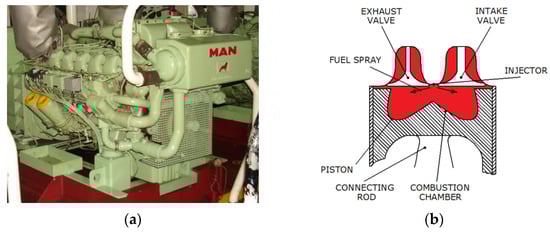 The engine analyzed in the present work is the MAN D2840LE V10 (Figure 2a). It is a four-stroke diesel engine, supercharged, with direct injection. It consists of 10 V-shaped cylinders arranged at 90°, with a unit displacement volume of 1827 cm3/cylinder. This study was conducted with the engine running at full load, developing a power of 320 kW at a speed of 1500 rpm. Figure 2b shows the section of each cylinder in the top dead center (TDC) position. The diesel oil injector is placed in the centre of the combustion chamber and injects the fuel in the form of a spray.