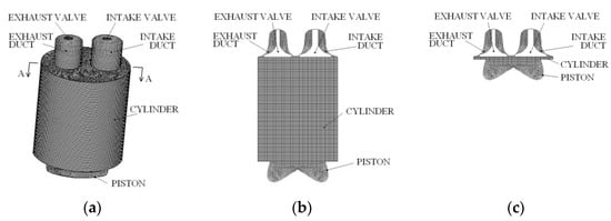 Computational fluid dynamics procedures consist on discretizing both the domain and governing equations. The domain discretization, also called grid or mesh, is shown in Figure 3. Particularly, the 3D mesh at BDC (bottom dead center) position is shown in Figure 3a, while Figure 3b shows the AA section at BDC position and Figure 3c the AA section at TDC position. This mesh corresponds to the red part illustrated in the previous Figure 2b.