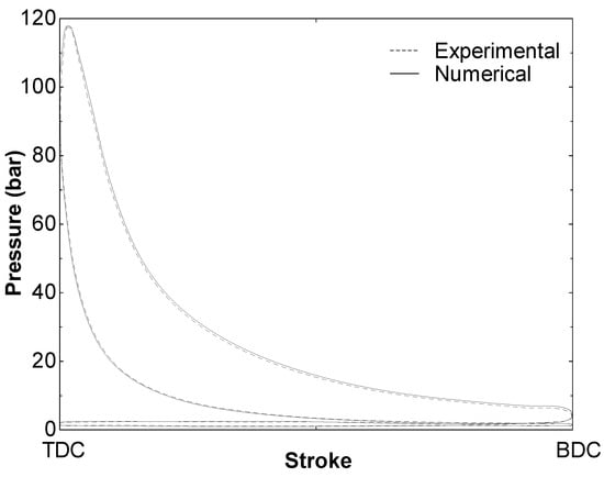The simulations were carried out through the free software OpenFOAM. They are based on the equations of conservation of mass, momentum and energy. In addition, an additional equation was added for each species involved. The details of the numerical model applied to this engine have been described in previous works [37,38,39] and thus only a brief summary of the numerical model is described herein. The fuel droplet breakup was treated through the Kelvin-Helmholtz and Rayleigh-Taylor breakup models, and the heat-up and evaporation of the droplets through the Dukowicz model. As a diesel oil combustion model, the kinetic scheme of Ra and Reitz [40] was employed. As an NOx formation model, the kinetic scheme proposed by Yang et al. [41] was employed. As an NOx reduction model, the kinetic scheme proposed by Miller and Glarborg [42] was employed. As an ammonia combustion model, the kinetic scheme proposed by Mathieu and Peterson [43] was employed. The validation between numerical and experimental results is illustrated in Figure 4 and Figure 5. A Gasboard-3000 analyzer was used to characterize NOx and CO2 emissions (3% NOx accuracy, 2% CO2 accuracy) and MALIN 6000 to characterize the pressure field (1% accuracy). As can be seen, Figure 4 and Figure 5 show a reasonable concordance between the experimental and numerical results, which supports the suitability of the numerical model to analyze this engine. Ammonia was not employed in the experimental setups due to its toxicity. An accident during the experiments could easily cause the immediate death of the people who handle it.