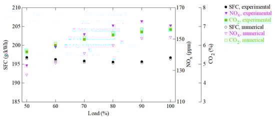 Consumption and emissions of CO2 and NOx experimentally and numerically measured. Operation under diesel combustion without ammonia.