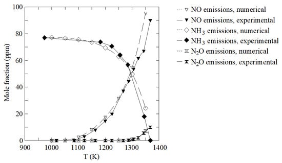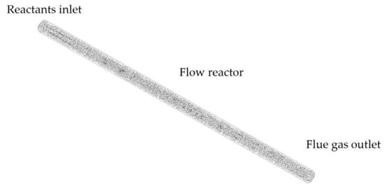 Regarding the validation of the kinetic schemes related to ammonia, an experiment from the literature was reproduced through CFD. In particular, the flow reactor measurements from Hulgaard and Kim Dam-Johansen [44] were employed. These authors used a cylindrical flow reactor with a 5.1 mm diameter and 14 cm length and characterized the emissions of NH3, NO, and N2O produced by oxidation of ammonia under several temperatures. In order to validate the model, these experiments were reproduced through CFD. The mesh is shown in Figure 6 and the comparison between the numerical simulations and the experimental results of Hulgaard and Kim Dam-Johansen [44] is shown in Figure 7. These results correspond to 800 ppm initial ammonia concentration. As can be seen, a reasonable agreement was obtained, which ratifies the accuracy of the kinetic schemes employed for ammonia in the present work.