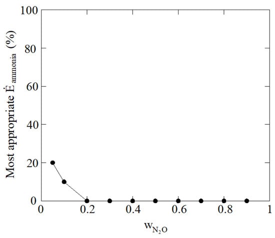 Figure 9 provides a graphical illustration of the most appropriate ammonia percentage against the weight assigned to N2O emissions using the data indicated in Table 4. As indicated above, the N2O emissions constitute a crucial role in the decision process. The high environmental cost of N2O make these emissions too decisive. When the weight assigned to N2O is incremented the most appropriate ammonia proportion in the fuel is reduced since these emissions increase considerably. The emissions of NH3 are also increment as more ammonia is employed as a fuel. On the other hand, CO2 emissions are not too relevant in the decision-making procedure due to the lower environmental cost of CO2 in comparison to N2O, NH3 and NOx.