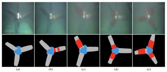 As climate change becomes more intense, the development of clean energy sources is gradually accelerating [,]. Marine current energy is recognized as a promising source of clean energy due to its predictability, high energy density and limited environmental impact [,]. The marine current turbine (MCT) can convert marine current energy into electrical energy. However, MCTs are deployed underwater, and attachments can accumulate over time on the submerged surfaces of the MCT, such as plankton or biofouling []. The work of Farkas et al. [] indicates that more than 80% of the areas on the blades of a normally operating MCT have the potential to be attached. Attachments can cause increased fatigue load and unbalanced torque, which can threaten the structural stability of the MCT. Most importantly, there is a reduction in the energy conversion efficiency of MCTs since the roughness of the blade surface is changed by attachment [,,]. Therefore, it is necessary to clean and maintain the MCT to ensure its stable and efficient operation. However, the marine environment poses problems in accessibility, which means that the maintenance of the MCT will be time-consuming and costly []. Consequently, it is important to recognize the attachment of MCT blades accurately and quickly, which facilitates the optimization of maintenance schedules and even on-demand maintenance, thus reducing maintenance and monitoring costs and improving power generation efficiency.