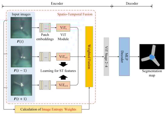 In contrast to the previous methods, semantic segmentation (SS) is capable of classifying each pixel of an image, which can eliminate the drawbacks associated with the above methods. Peng et al. [] first introduced SS to the attachment recognition of MCT blades, combining fine features into the encoder to optimize the segmentation contours and improve accuracy. The pixel-level recognition results can be used as output and visualized, thus giving detailed information on the location and coverage of the attachment and therefore facilitating the provision of real-time and detailed information on the status of the blades to the monitoring personnel. However, the MCT operation is affected by various factors, such as turbulence, and the rotational speed is not constant. These factors result in different degrees of motion blur in the acquired MCT images, which causes the degradation of feature extraction, leading to changes in the edge and texture features and potential recognition failures []. This will lead to a significant reduction in the recognition accuracy of SS when the rotational speed of the MCT changes. The above problem shows the poor robustness of the SS method against the variation of the MCT rotational speed, which leads to the inability to achieve the ideal recognition performance when encountering an unknown rotational speed situation. In order to address this issue, a SS method is proposed for the attachment recognition of MCT blades in this paper, which is based on image entropy weighted spatio-temporal fusion (IEWSTF). The core idea of this method is to perform feature extraction on multiple adjacent frames simultaneously and construct a feature mapping from other frames to the key frame through feature learning, which reflects the spatio-temporal (ST) features between adjacent frames and alleviates the degradation of feature extraction due to motion blur. A spatio-temporal fusion (STF) mechanism is designed to learn the ST features. In addition, an image entropy weighting (IEW) mechanism is proposed to adaptively adjust the fusion weights of adjacent frames to prevent inaccurate feature learning due to the excessive differences between frames. The experimental results demonstrate the superior performance of the proposed method compared to other methods, with highly accurate attachment recognition for MCT blades at high rotation speeds and robustness against rotational speed variations.