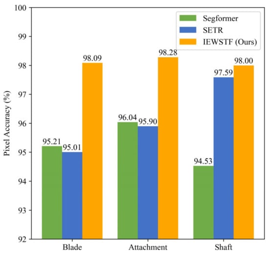 As seen in Figure 3, the proposed method achieves 98% PA in all three categories, which is higher than the other two comparison methods. Furthermore, there is a significant improvement in PA in both the blade and attachment categories with respect to SETR and SegFormer, in the range of 2–3%, which shows the superiority of the proposed method in the attachment recognition of MCT blades. In fact, the motion blur is mainly reflected in the positions of the blades and attachments in the images, which indicates that the proposed IEWSTF can effectively overcome the degradation of the feature extraction caused by motion blur.