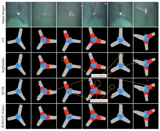 In order to more intuitively evaluate the effectiveness of attachment recognition, a qualitative comparison is made with the SS results of all methods. Figure 4 shows some of the comparison results. As seen in Figure 4, the higher quality can be seen in the segmentation maps output by the proposed method compared with the other two methods. It is seen that the contour of the segmentation map of IEWSTF is closer to the GT. The other two methods are more obviously affected by motion blur, and distortion is observed in the segmentation maps at various rotational speeds.