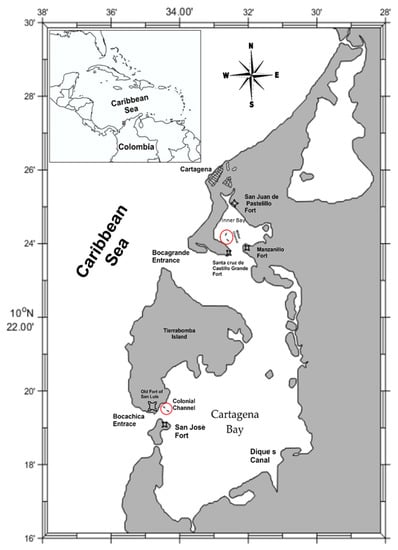 Cartagena Bay (Colombia) is located in the northeast of South America, in the Caribbean Sea, between latitudes 10.26° N and 10.45° N and longitudes 75.5° W and 75.6° W (Figure 1). In 2019, Cartagena de Indias population showed more than one million inhabitants, and its bay is, at present, considered a strategic place for the economy of Colombia since it holds important ports, industry and truism activities. Tierra Bomba Island separates the Bay from the Caribbean Sea, forming a shallow basin of 84 km2, with an average depth of 26 m. The access to the Bay takes place through the Bocagrande and Bocachica entrances. The former is located on the northern side of the bay, while the latter, which is deeper and allows the entry of larger ships since colonial times, is located on the southern side. The Bay presents estuarine characteristics [22] because it is influenced by the Canal del Dique, an artificial arm of the Magdalena River.