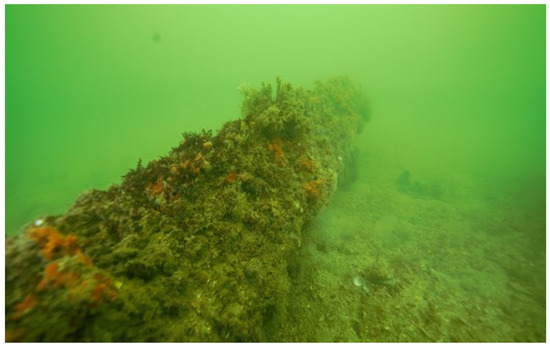 Non-intrusive inspection with autonomous diving. The sites have evidence of organic material (wood) and inorganic material (ballast rocks). Additionally, encrusting organisms are observed, such as sponges and algae, to have adhered to the wooden structures, which indicates the presence of a consolidated biofilm (Figure 2) that can affect the chemical conditions of the woody elements. This aspect needs to be deeper evaluated in future investigations. However, the wrecks still retain their shape, which is partly due to the exigent Spanish regulations at the time of their construction, for example, in the selection of materials, in this case, in wood of excellent quality [34,55,56]. Lastly, it is important to mention that no objects with precious metals or with high commercial value were observed; therefore, the material found has a cultural value (Figure 2) exclusively.