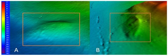 Bathymetric surface surveyed with an MBES. In the image, two ships are visible with respect to coverage; note the differences in the orange colouring in Box (A). Bocachica, the ship (África) is covered. In Box (B), the ship in the Inner Bay (Conquistador) is uncovered. The colour scale indicates the depth in metres.