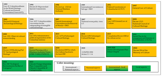 Figure 4 indicates some instruments that Colombia has developed since 1983 in the different matters that make up the legal protection of the nation’s cultural heritage. Within a total of 26 legal tools, 6 are the result of the integration of international agreements and the rest corresponds to national and local decrees/laws; the most relevant are cited in this study. It is important to indicate that Colombia signed—but has not yet ratified—the United Nations Convention on the Law of the Sea (UNCLOS), and it is not part of the Convention on the Protection of the Underwater Cultural Heritage of UNESCO [1].