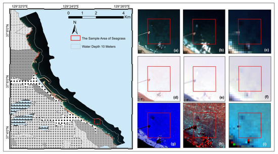 Impact of atmospheric, sun-glint, and water column corrections on the Uljin–gun area: (a) atmospheric correction of GeoEye-1, (b) atmospheric correction of Sentinel-2, (c) atmospheric correction of Landsat-8, (d) sun-glint corrections of GeoEye-1, (e) sunglint corrections of Sentinel-2, (f) sunglint corrections of Landsat-8, (g) water column corrections of GeoEye-1 (h) water column corrections of Sentinel-2, and (i) water column corrections of Landsat-8.