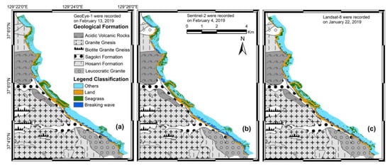 The classification results of the SVM methods for seagrass distribution in the Uljin-gun using (a) GeoEye-1 (b) Sentinel-2 (c) Landsat-8 satellite, with Lyzenga water column correction.