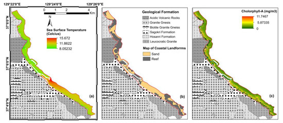 Oceanography conditions mapping (a) sea surface temperature distribution (b) map of coastal landforms along Uljin-gun (c) chlorophyll-a distribution.