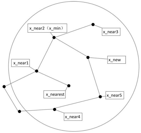 where the value of is one-fifth of the step of the bias_RRT* algorithm. According to Equations (1) and (2), one can get the coordinates of the two points and :