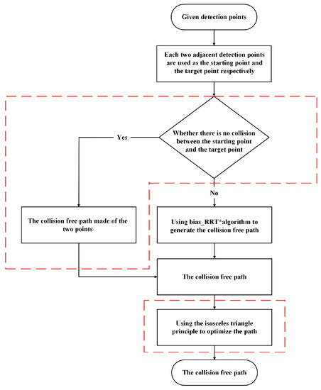 When applying detection path planning, not all adjacent detected points have obstacles to reach them. The flow chart of the detection path planning algorithm is shown in Figure 4. When the detection path point is given, whether there is an obstacle between two adjacent points should be evaluated. If there are obstacles, the improved RRT* algorithm is applied for path planning to get the collision-free path. Alternatively, if there are no obstacles, a straight line between the two points gives the collision-free path, thus saving computational time for the overall path planning task.