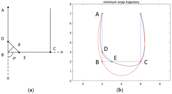 When optimizing the path under the proposed method, the trajectory is likely to diverge from the planned path; thus, the probability of the trajectory encountering obstacles is likely to increase. Bigger Euler angles denote a greater distance between the trajectory and the planned path. Accordingly, this increases the probability of hitting obstacles. We treat every three adjacent points in the path points as A, B, and C to show the principle of the proposed optimization function in Figure 5. The two points D and E represent the new path points through which the trajectory deviation is optimized.