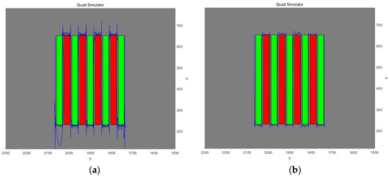 In order to apply the detection task, we give a series of monitoring points, which are the path points that the UAV must pass through. The selection of the monitoring points should fulfill an appropriate distance to the detection target. The simulation experimental parameters are shown in Table 1. The improved algorithm is experimented according to two task scenarios. In the following simulation results, the white line represents the path generated by the algorithm, while the blue line represents the desired trajectory of UAV, the red line represents the actual trajectory of UAV, and the yellow line represents the errors between the actual and desired trajectory. All simulation experiments were performed using MATLAB on a laptop with a 2.20 GHz Intel i7 CPU. The specific parameters in the experiment are shown in Table 1.